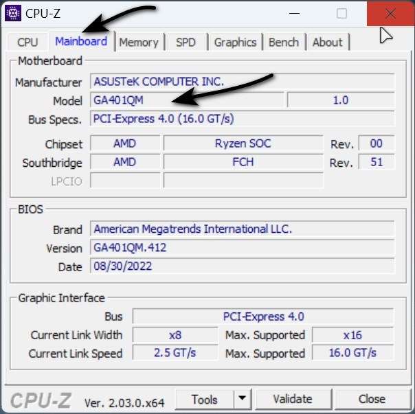 - Для ноутбуков можно искать максимум ОЗУ конкретно по модели ноута, либо по маркировке материнской платы, которую опять же смотрим в графе Mainboard в CPU-Z.