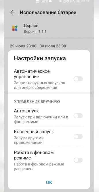 После инсталляции аппа нужно зайти в настройки, меню «Приложения», найти там программу Gspace и отключить опции «Автозапуск», «Косвенный запуск» и «Работа в фоновом режиме». Они находятся в подразделе «Использование батареи» > «Настройки запуска».