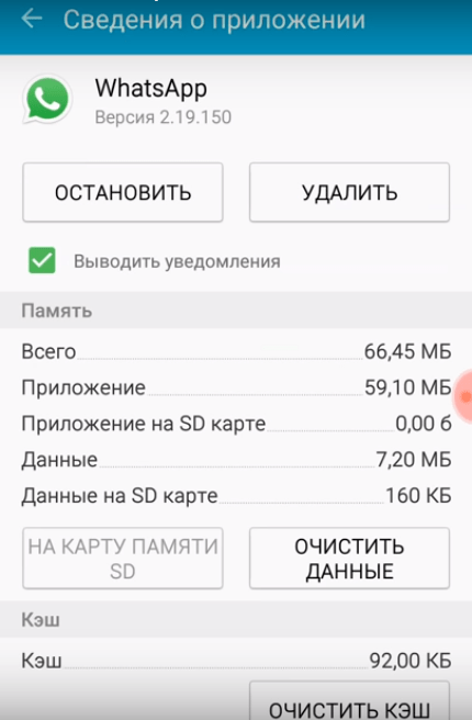 - Откройте список установленных приложений на своем смартфоне, найдите WhatsApp и нажмите на него. Затем в появившемся окне жмем на кнопку «Остановить», затем «Очистить данные», а только потом «Удалить».