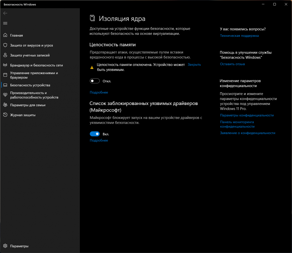 - Откроется раздел «Параметров». Ищем опцию «Целостность памяти», деактивируем ее и перезагружаем компьютер.
