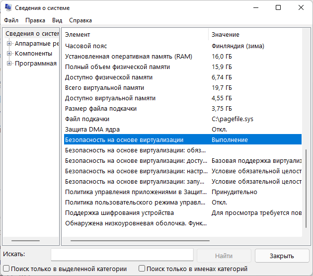 - Ищем пункт «Безопасность на основе виртуализации» и смотрим, что стоит напротив. Если там «Откл.», значит VBS уже отключена, ничего делать не нужно.