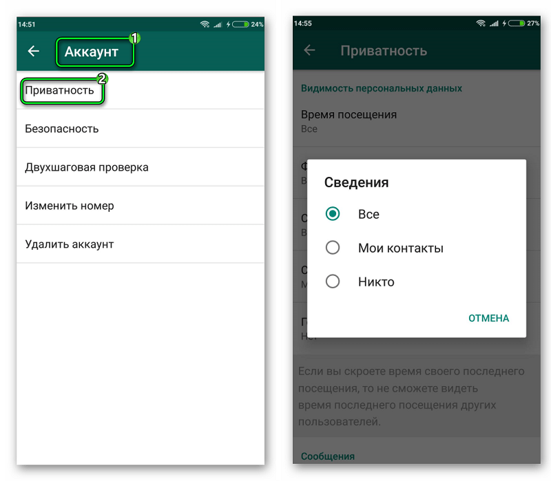 Также в WhatsApp можно отключить отчеты о прочтении, чтобы собеседник не знал, прочли вы его сообщение или нет. Но в таком случае также не будет показываться, когда другие пользователи читают ваши сообщения. Инструкция по отключению отчетов показана на скриншотах ниже, нужно всего лишь снять галочку в пункте «Отчеты о прочтении» во вкладке приватность.
