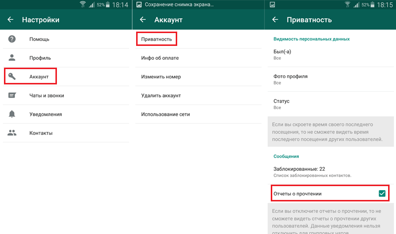 Также в WhatsApp можно отключить отчеты о прочтении, чтобы собеседник не знал, прочли вы его сообщение или нет. Но в таком случае также не будет показываться, когда другие пользователи читают ваши сообщения. Инструкция по отключению отчетов показана на скриншотах ниже, нужно всего лишь снять галочку в пункте «Отчеты о прочтении» во вкладке приватность.