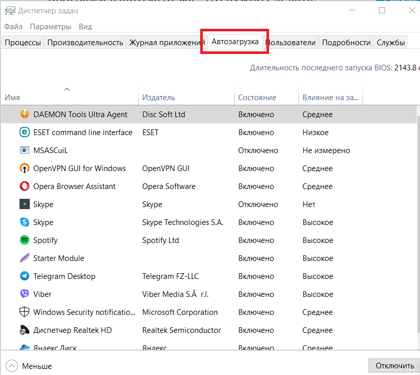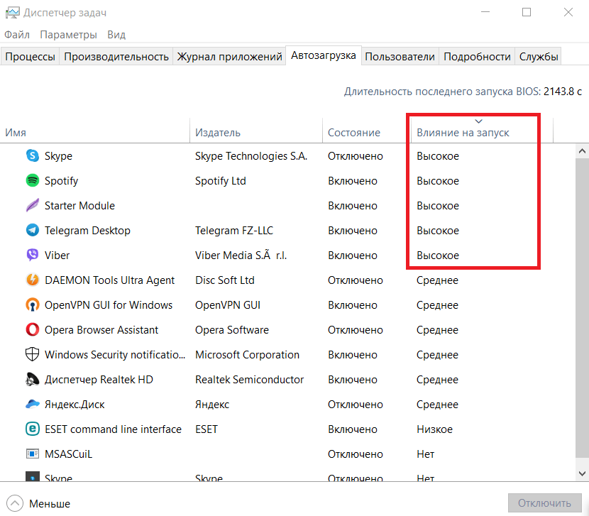 - Отключаем программы, которые не нужно запускать сразу после перезагрузки. Если в списке все программы нужны — отключите хотя бы часть тех, у которых Влияние на запуск указано Высокое.