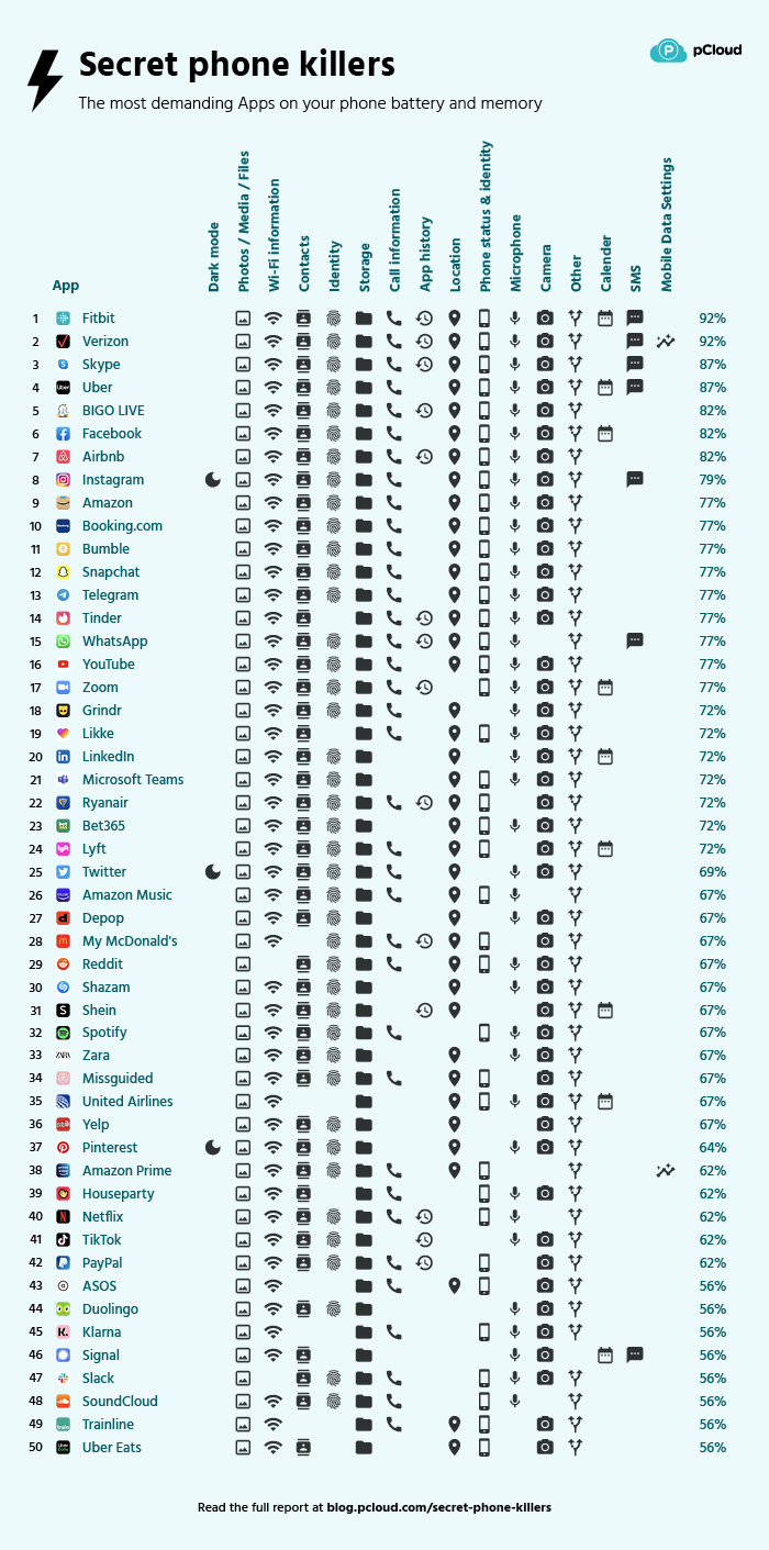 Голландский сервис pCloud сравнил 100 самых популярных Android-приложений с точки зрения расхода аккумулятора, а также использования оперативной и постоянной памяти. Результаты теста показывают, какой софт больше всего разряжает и замедляет работу наших смартфонов.