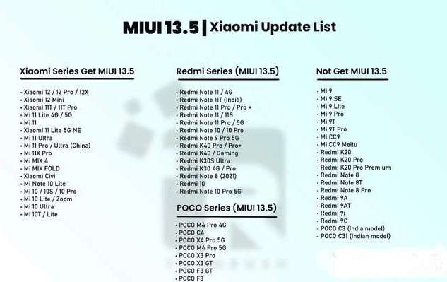 Профильное издание Xiaomiui сегодня опубликовало список устройств, которые получат MIUI 13.5. Все они представлены на изображении.