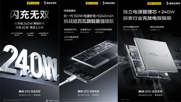 Realme GT 5 дебютирует 28 августа. Он станет продолжением флагмана GT 3, который вышел всего 5 месяцев назад и стал первым смартфоном с 240-ваттной зарядкой на рынке. Серьезных изменений в характеристиках не ожидается, китайцы обновят только процессор и дизайн устройства.