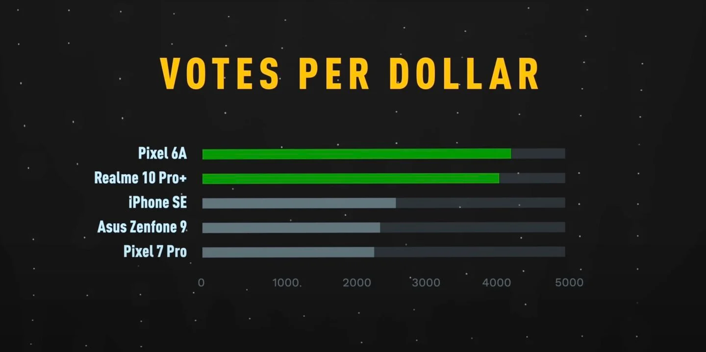 Маркес отметил лучшие и самые плохие модели в соотношении «цена/качество», где по общим результатам голосования лидером снова стал Google Pixel 6A, а худшим — снова Sony Xperia I IV.