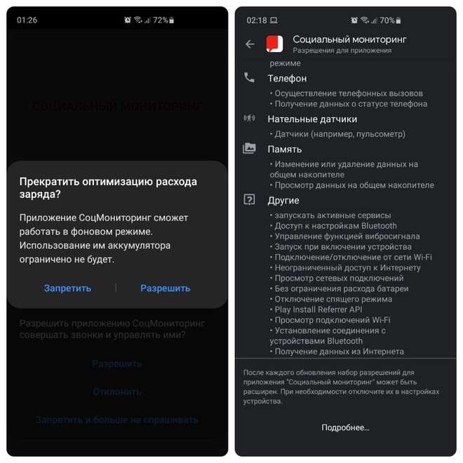 Для установки «Социального мониторинга» придется предоставить ему полный набор прав: доступ к звонкам, геолокации, фотографиям и видео, подключениям по Bluetooth и Wi-Fi, управление батареей, а также всей файловой системой смартфона. Вдобавок к этому, в приложение «вшита» еще и система распознавания лиц, сканирующая лицо владельца смартфона.