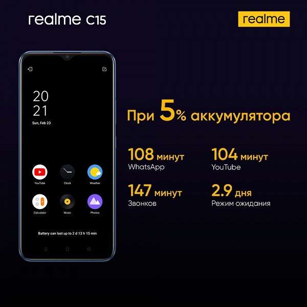 Главной фишкой Realme C15 является аккумулятор на 6000 мАч с поддержкой быстрой 18 Вт зарядки. Производитель утверждает, что на 5% заряда телефон может продержаться до 3 дней в режиме ожидания и 1 час. 44 минуты крутить видео на YouTube – солидные показатели. Только вот заряжается C15 через порт MicroUSB, что не может не разочаровывать.