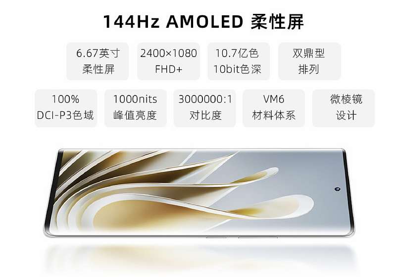 Переднюю часть устройства занимает большой 6.67-дюймовый AMOLED-экран. Панель имеет разрешение 2400×1080 пикселей, то есть это Full HD+. Также заявлена высокая частота обновления 144 Гц и глубина цвета 10 бит. Дисплей охватывает 100% цветовой гаммы DCI-P3, и имеет пиковую яркость 1000 нит. Селфи-камера на 16 МП разместилась в круглом отверстии по центру экрана.