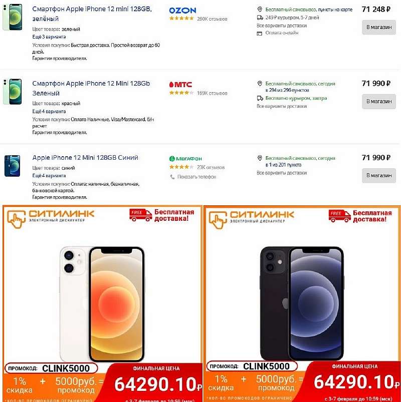 Например, действительно выгодная акция скоро начнется в Ситилинке. Магазин выходит на платформу Tmall, где в честь открытия будет продавать iPhone 12 Mini 128 ГБ за 64 290 рублей, а первые 500 покупателей смогут получить купон на пол кэса и забрать компакт за 63 790 рублей. Таких скидок у официалов еще не было. Для понимания выгоды: в других крупных сетях такой аппарат без скидок стоит 72 тысячи.