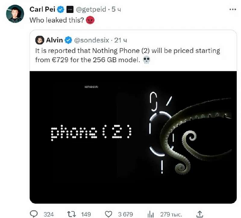 11 июля бренд Nothing представит свой новый смартфон Phone (2). Некоторые подробности устройства уже были официально раскрыты, но известно еще не все. В частности, под вопросом оставалась цена. В прошлом году многие покупатели отказались от Phone (1), посчитав его слишком дорогим для заявленных характеристик, хоть устройство и выделяется необычным дизайном. Похоже, что глава компании Карл Пей считает, что второе поколение с улучшенным железом должно стоить еще больше.