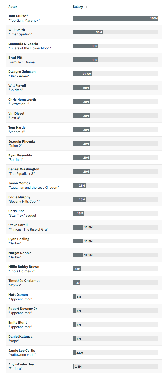 Больше всего за съемки сейчас получает Том Круз. Последняя суперзвезда Голливуда заработал $100 долларов за фильм «Топ Ган: Мэверик», который уже стал самым кассовым в истории студии Paramount. За него Круз получил свой стандартный гонорар в 20 млн долларов, а также процент с кинотеатрального проката.
