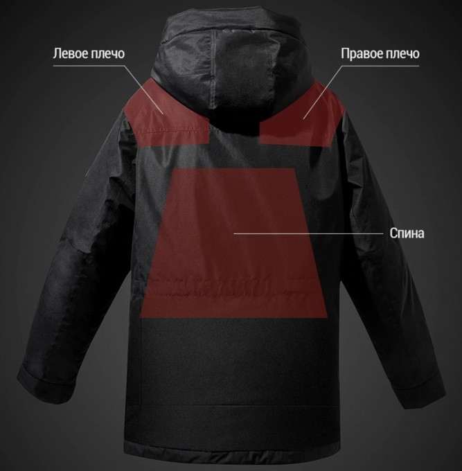 Все самое интересное спрятано внутри. В зоне спины и шеи в подкладку вшита специальная пленка из углеродных нанотрубок, которая запитывается от повербанка (кабель выведен во внутренний карман) и обогревает владельца. Предусмотрено четыре режима нагрева – 38, 43, 48 и 53 градуса. Они переключаются с помощью кнопки, расположенной над главным карманом справа, а при работающем подогреве кнопка еще и подсвечивается – настоящий хайтек.