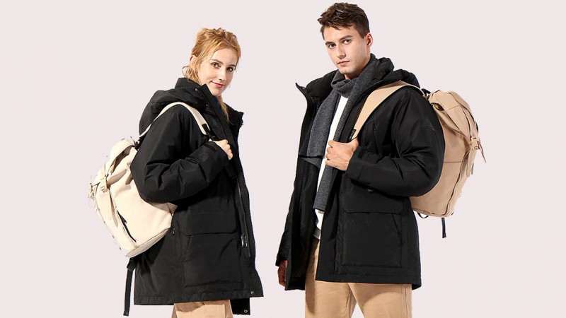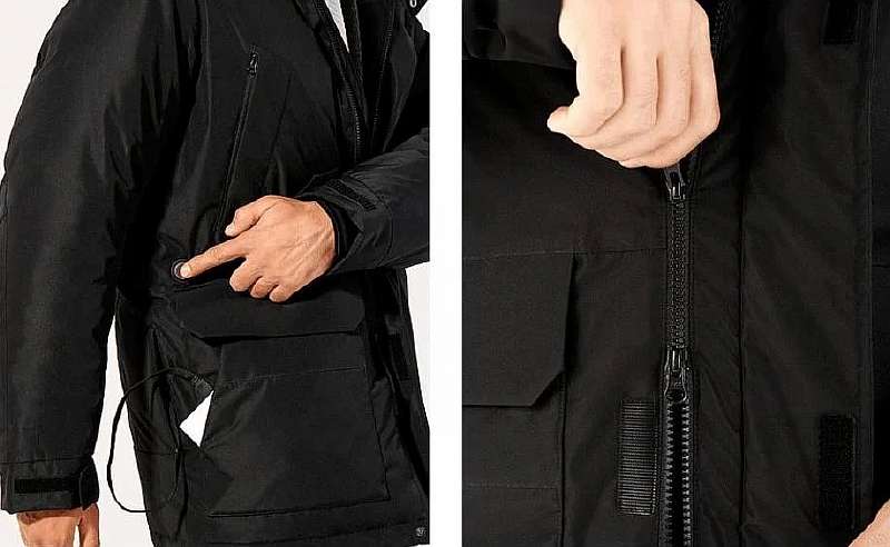 Визуально Heated Parka выглядит как обычная курточка, она полностью черная и сделана в универсальном неброском дизайне. В качестве стандартного утеплителя используется натуральный утиный пух, а наружная ткань обеспечивает защиту от влаги по стандарту IPX4, то есть легкий дождь ей нипочём.
