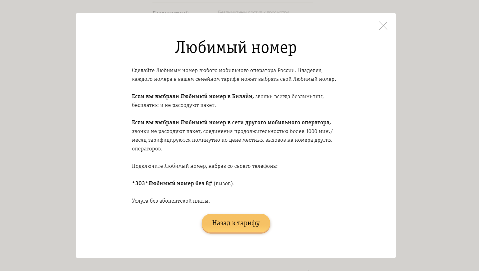 Для начала о том, на каких тарифах действует «Любимый номер» Билайн: