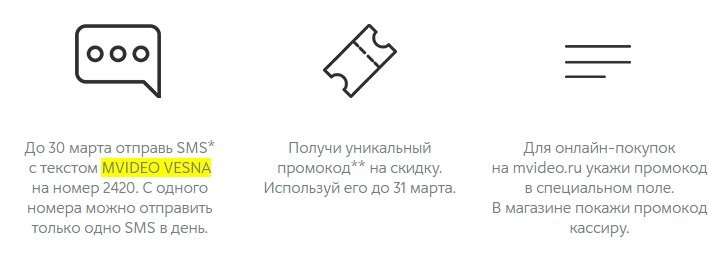 Крупнейшая сеть по продаже электроники М.Видео запустила акцию, в рамках которой покупатели могут получить промокод со скидкой на сумму до 7000 рублей. Чтобы принять участие в акции необходимо отправить сообщение с текстом MVIDEO VESNA на короткий номер 2420. После этого в ответном СМС вы получите уникальный промокод, который нужно ввести в соответствующем поле при оформлении покупки на сайте компании или предъявить кассиру в магазине.