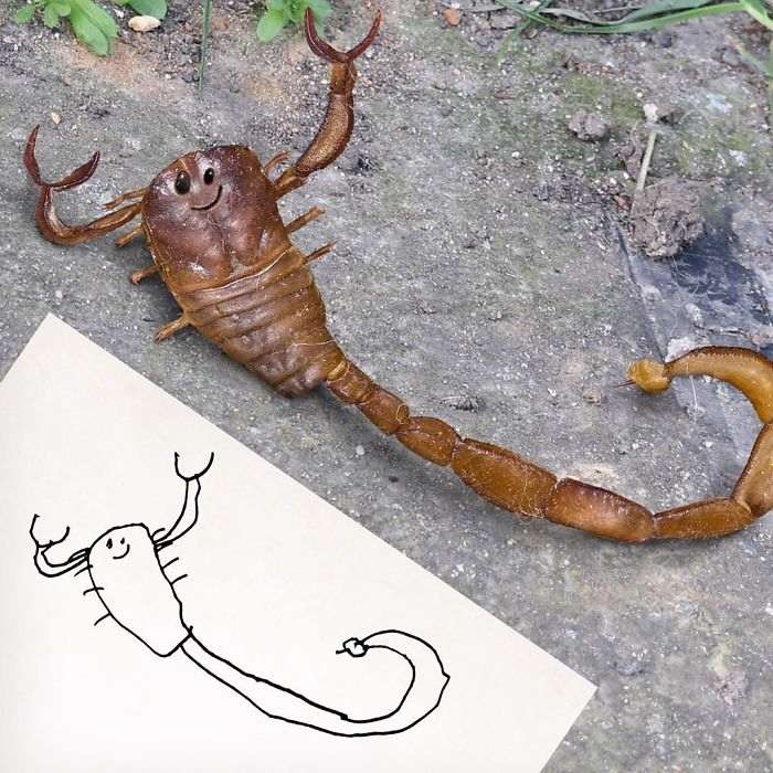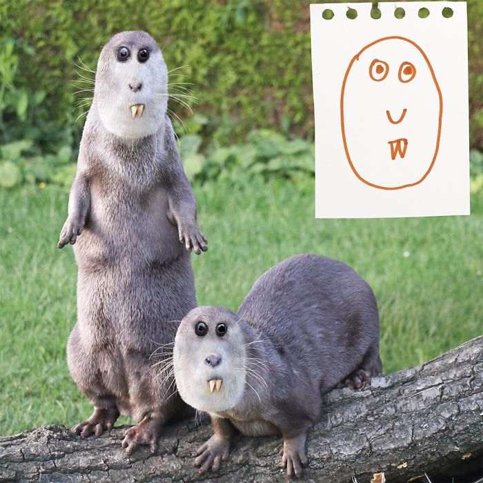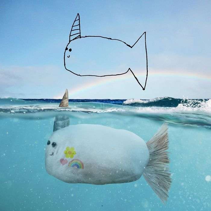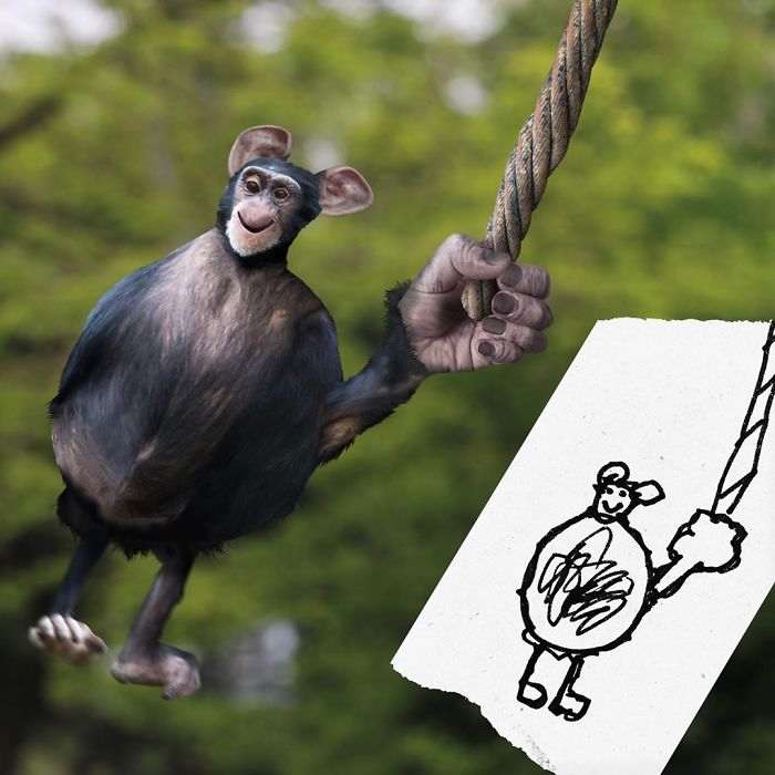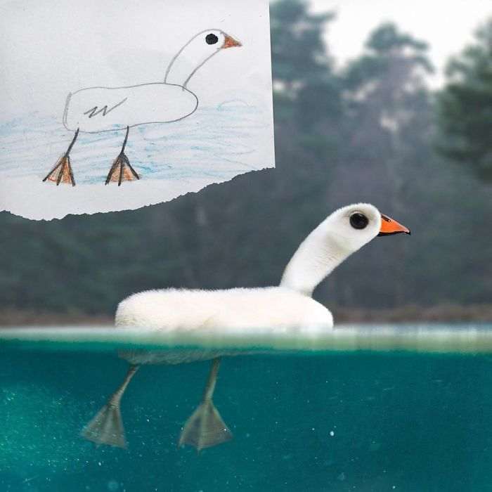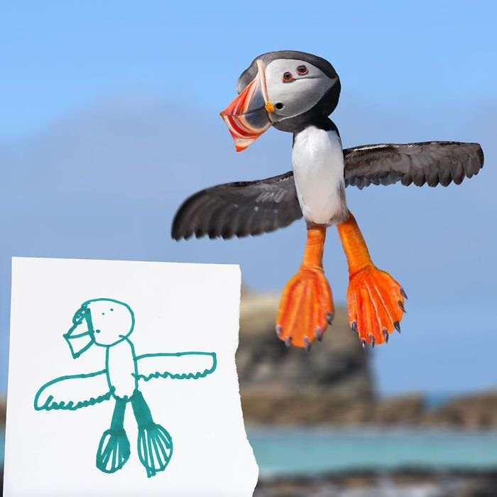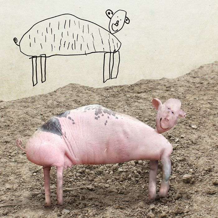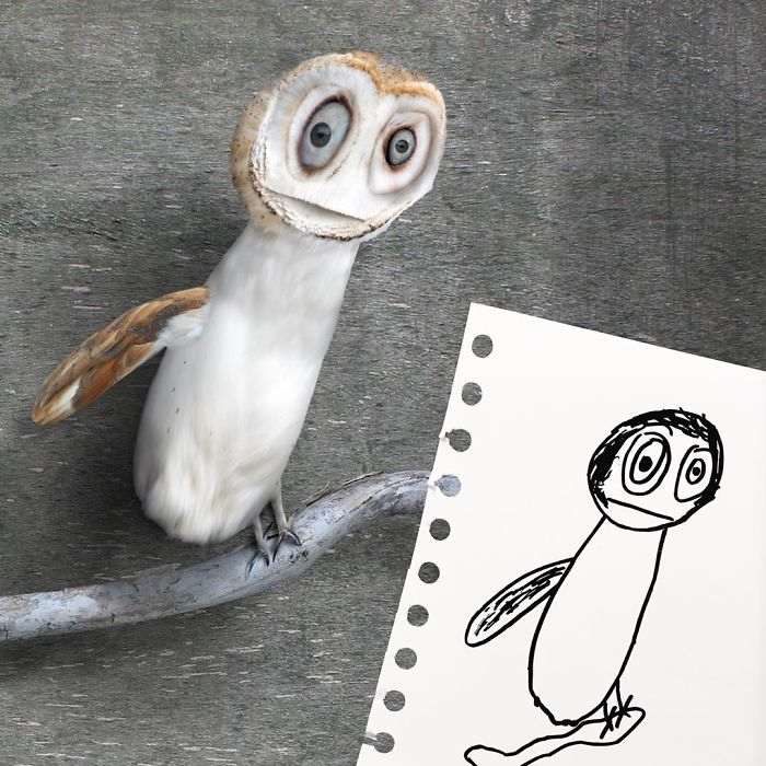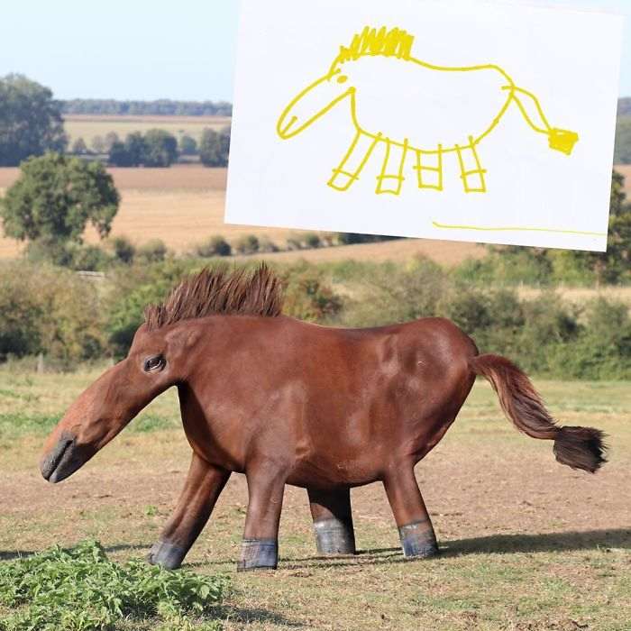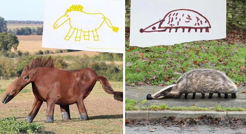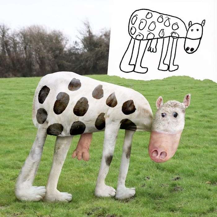 Жирафы, птицы, медведи, люди и все остальное, что умудряется рисовать ребенок с безграничным воображением, превращается в немного странные, но очень забавные и веселые фотографии, которые способны поднять настроение кому угодно.