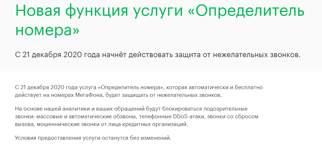 Начиная с 21-го декабря нынешнего года, «МегаФон» модифицирует опцию «Определитель номера», прикрутив к ней функцию «Защита от нежелательных звонков». Это значит, что любые вызовы с сомнительных номеров будут автоматически блокироваться, избавляя абонента от необходимости общаться с мутными личностями вроде спамеров и мошенников. Отсекать будут и звонки со сбросом вызова, и DDoS-атаки, и вообще все, что окажется в регулярно пополняющейся базе скомпрометированных номеров.