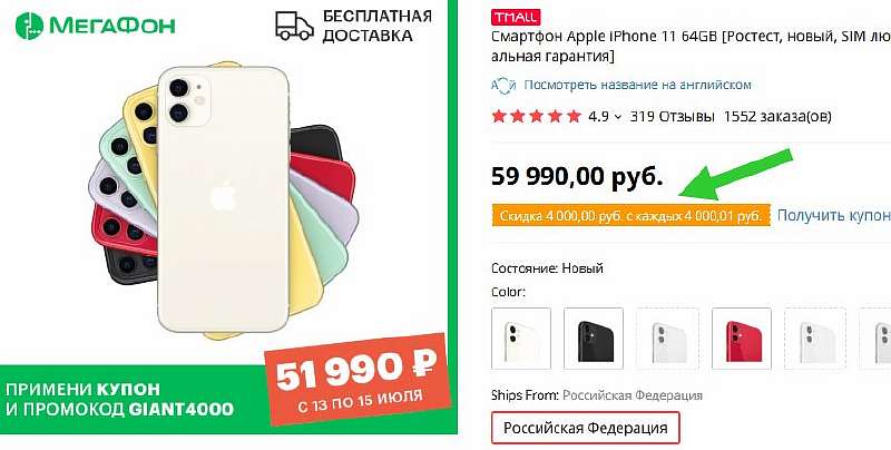 Более свежий iPhone 11 подешевел до 51 990 рублей. Для сравнения, аналогичная версия на 64 ГБ в рознице стоит 59 990. Скидка берется по такой же схеме, только нужно использовать промокод GIANT4000.