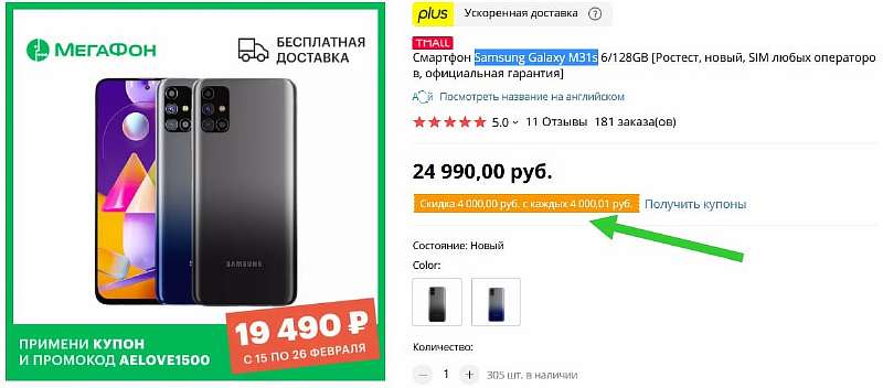 Что по цене? В Мегафоне Galaxy M31s сейчас отдают за 19 490 рублей, и это однозначно выгодное предложение, поскольку на Яндекс.Маркете он оценен минимум в 22к, а прайс в официальной рознице составляет 25 тысяч рублей. Вот линк на акцию, используйте купон со страницы товара и промокод AELOVE1500, чтобы получить скидку.