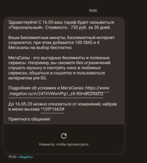 Мегафон начал рассылку очередных «писем счастья». В сообщениях оператор предупреждает, что с 16 мая 2023 года собирается перевести часть абонентов с их действующего тарифного плана на «Персональный». И условия последнего остаются желать лучшего.