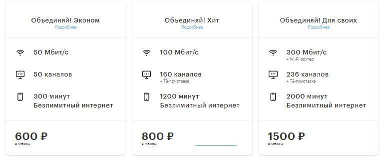 Самый дешевый тариф — «Объединяй! Эконом» стоит 600 руб/месяц (Москва), что сравнимо с ценой связи в линейке основных тарифов оператора «Включайся!». Управлять всеми услугами сразу (связь + интернет + ТВ) можно из личного кабинета Мегафон.