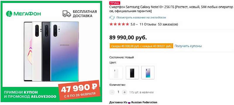 Мегафон пишет о скидке 42 тысячи рублей – сумма внушительная, если считать от первоначальной цены Note10+ на старте продаж. Сейчас флагман можно найти за 55-60 тысяч в серых магазинах, так что по факту скидка скромнее. Но если учитывать, что у Меги белые смартфоны с гарантией и быстрой доставкой на дом, предложение ритейлера выглядит в разы интереснее. Тем более, что у большинства крупных сетей запасы Note10+ уже закончились и сейчас распродают последние партии устройства.