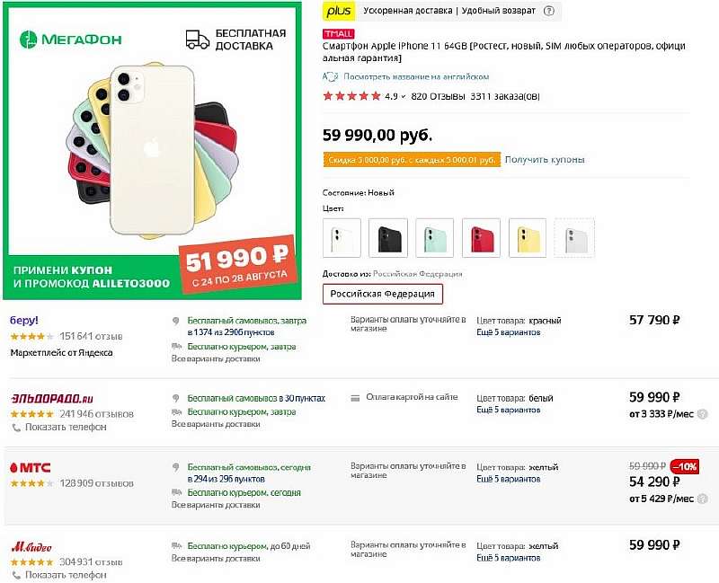 Сильнее всего в Мегафоне подешевел хитовый iPhone 11. Базовую версию с 64 ГБ памяти отдают за 51 990 рублей (линк на акцию), что сравнимо с ее ценой на сером рынке. Причем цену срезали сразу с трех конфигураций, поэтому если бюджет позволяет, рекомендуем брать оптимальные 128 ГБ, которые по скидке обойдутся 56 990 рублей (используйте промокод ALILETO3000 и берите купон на странице товара).
