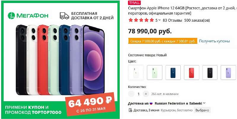 Например, актуальный iPhone 12 64 ГБ можно забрать за 64 490 рублей. Для сравнения, в М.Видео и у других официальных ритейлеров такой аппарат стоит 79 кэсов, а минимальный прайс по Яндекс.Маркету начинается с тех же 64 тысяч, но покупать такое дорогое устройство без официальной гарантии, которую дает Мега – сомнительная затея.