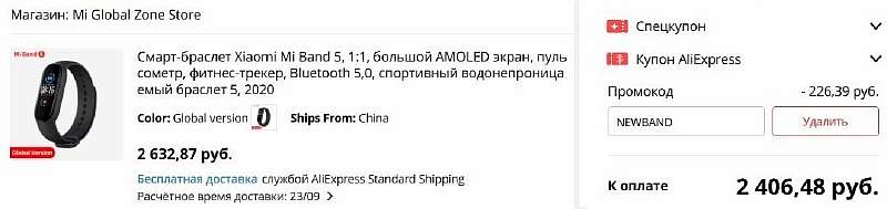 Прошерстив все актуальные предложения, самый дешевый Mi Band 5 на Али мы нашли в магазине Mi Global Zone Store (97.9% положительных отзывов). Продавец отдает гаджет за 2164 рубля, но если при оформлении заказа указать секретный промокод NEWBAND, его цена снижается до 1937 рублей. Вот ссылка на акцию.