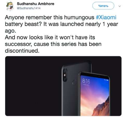 Но сегодня индийский инсайдер Сундханшу Амбхоре, распространяющий в подавляющем большинстве случаев проверенную и подтверждающуюся впоследствии информацию, опубликовал в своем Твиттере пост, что Xioami больше не намерена выпускать смартфоны Mi Max и вскоре будет официальное объявление о закрытии серии фаблетов.