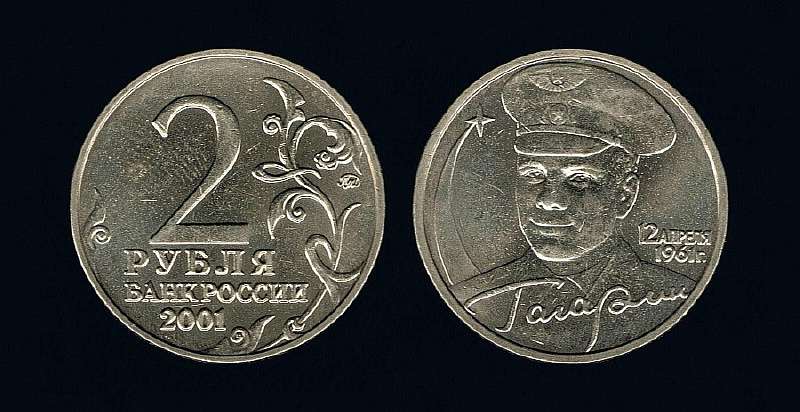 На 2001-й год пришлась 40-ая годовщина полета первого человека в космос. Такую знаменательную дату решили отметить выпуском юбилейных монет достоинством в 2 рубля. На ее аверсе вместо привычного двуглавого орла сдержанно улыбается Юрий Гагарин. Отчеканили таких монет много — 20 миллионов штук, причем поучаствовали как Московский, так и Петербургский монетный двор.
