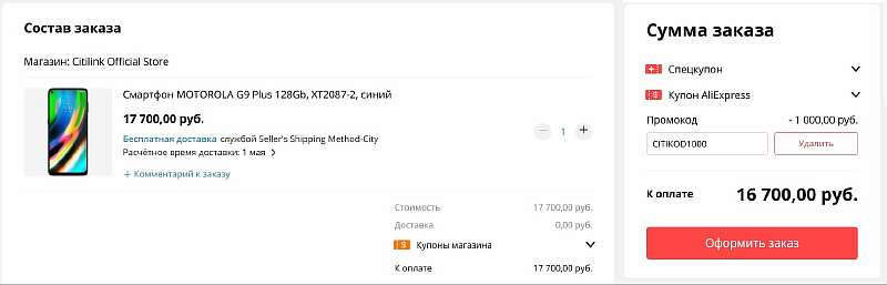 Речь идет о Motorola G9 Plus, которая практически везде продается по рекомендованной официальной цене в 19 990 рублей. Но в интернет-магазине Ситилинка на платформе Tmall ее выставили за 17 700 тысяч, а если использовать секретный промокод CITIKOD1000, смарт и вовсе обойдется приятнейшие 16 700 рубликов.