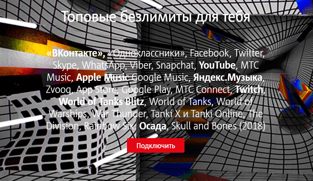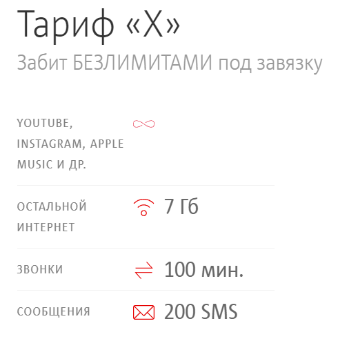 За ежемесячную плату в 500 рулей абонент получает 100 минут разговоров, 200 СМС-сообщений, безлимитный доступ к «ВКонтакте», «Одноклассники», Facebook, Twitter, Skype, WhatsApp, Viber, Snapchat, YouTube, МТС Music, Apple Music Google Music, Яндекс.Музыка, Zvooq, App Store, Google Play, МТС Connect, Twitch и нескольким видеоиграм, а также 7 ГБ трафика для доступа к остальным ресурсам, чего вполне достаточно, учитывая тот факт, что большинство наиболее «прожорливых» ресурсов безлимитны.
