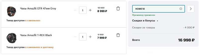 Отдельно стоит упомянуть Amazfit GTS 2 – это новейшая модель в стиле Apple Watch со встроенной памятью. На нее нет промокодов, но действует обычная скидка в тысячу рублей. GTS 2 можно забрать за 13 999 рублей, столько же они стоят у китайцев, откуда еще придется ждать пару недель доставки. Вот ссылочка и на этот девайс.