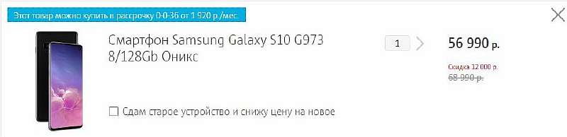 - Galaxy S10 128/8 ГБ – 56 990 рублей (стандартная цена 68 990 руб);