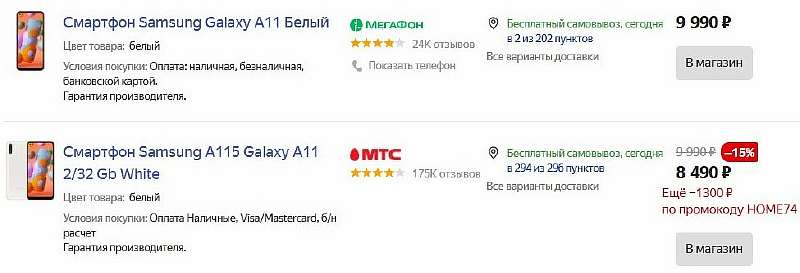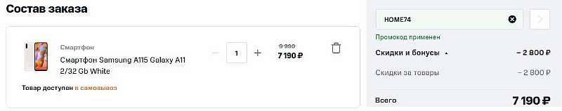 Galaxy A11 сейчас можно урвать за 7 190 рублей. Для этого нужно использовать промокод HOME74 и оформить покупку с самовывозом из салона МТС – на доставку эта акция не работает.