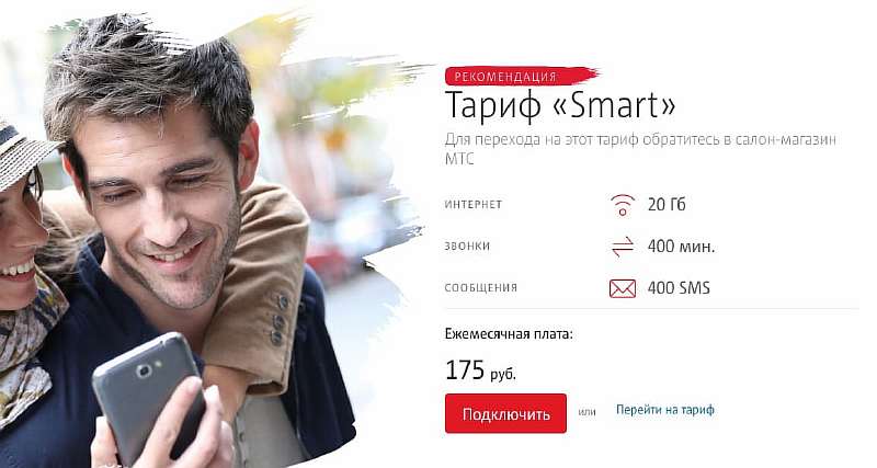 Если быть точным, МТС не запустили новый тариф, а обновил уже существующий пакет Smart. Конечно, пакеты обновляются регулярно, но в этот раз случай неординарный, поскольку тарифный план стал в три раза выгоднее. Цену урезали до 175 рублей, и за эти деньги клиент получает по 400 минут разговоров и сообщений, а также 20 гигабайт мобильного интернета. Правда есть теперь у данного тарифа и минусы. Его невозможно подключить, связавшись с оператором или через личный кабинет. Обязательно явиться лично в салон МТС и попросить, чтобы вас перевели.