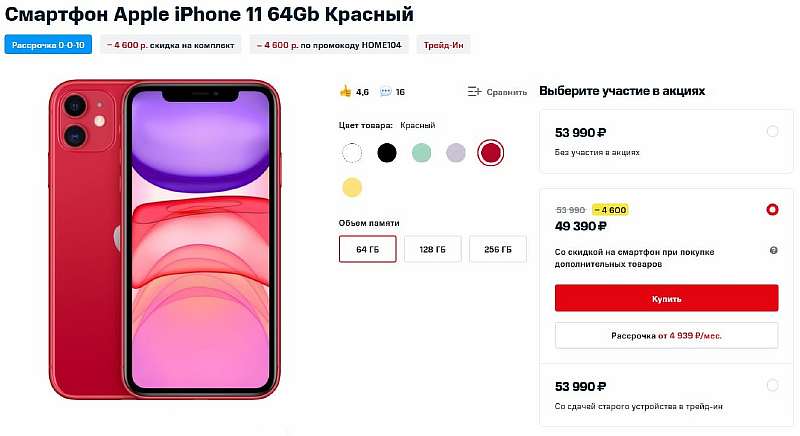 - iPhone 11 64 ГБ – 49 390 руб (промокод HOME104)