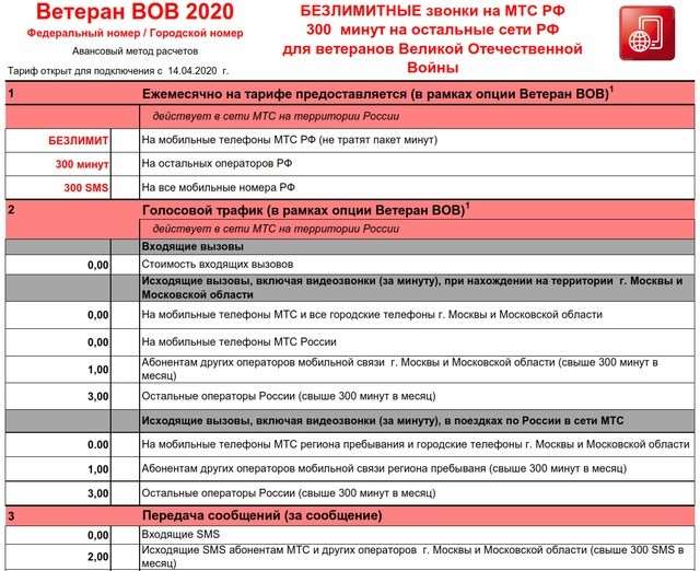Тарифный план «Ветеран ВОВ 2020» доступен с 14 апреля нынешнего года. Как несложно догадаться, подключить его могут только ветераны Великой отечественной войны при предъявлении соответствующих документов. Тариф предоставляет доступ к бесплатным и безлимитным звонкам на номера МТС по всей стране. Для звонков на номера других операторов доступен пакет из 300 минут, который дополняют еще и 300 SMS. Когда пакет звонков кончается, за минуту разговора берут ровно 1 рубль.