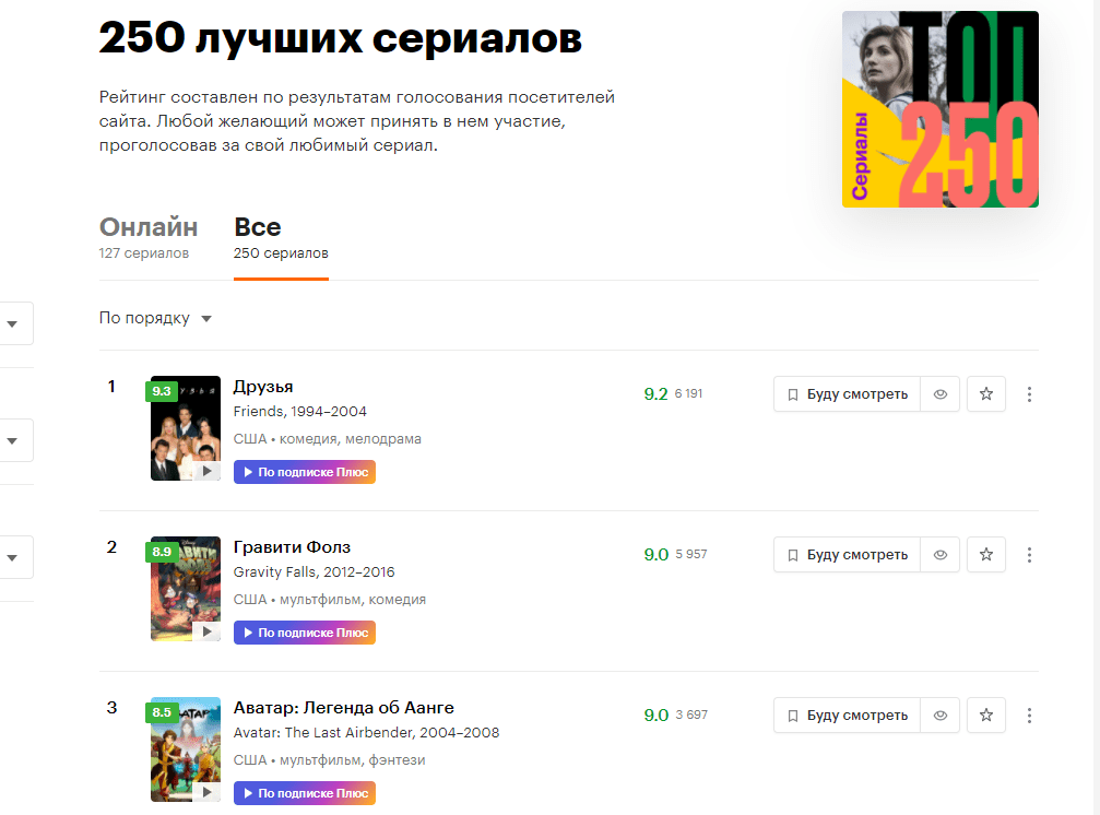 Интересные изменения произошли на крупнейшем российском сайте, посвященном кино, — «Кинопоиске». Теперь, помимо рейтинга из 250-и лучших фильмов всех времен, там можно найти и рейтинг лучших сериалов. Он также составлен на основе оценок посетителей ресурса.