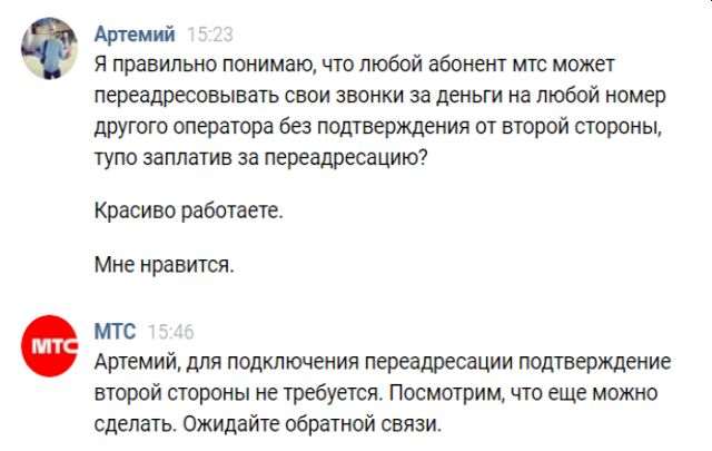 Спустя некоторое время меня всё-таки поняли, зарегистрировали моё обращение и попросили подождать. Через 20 минут пришёл ответ… «К сожалению, мы вынуждены отказать, так как вы не являетесь владельцем номера, с которого переадресуются вызовы».