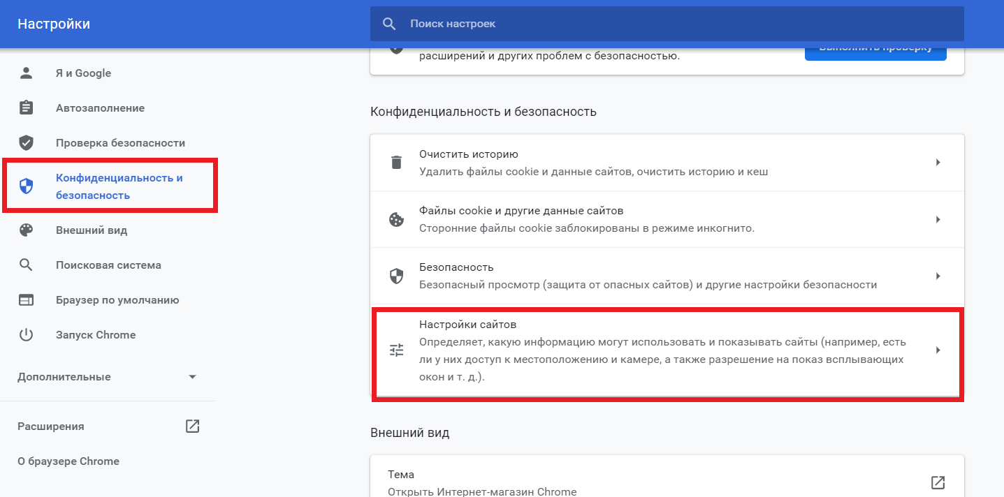 - Прокручиваем вниз, пока не увидим пункт «Настройка сайтов».