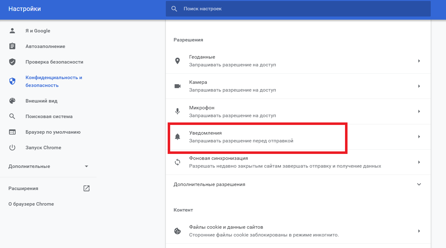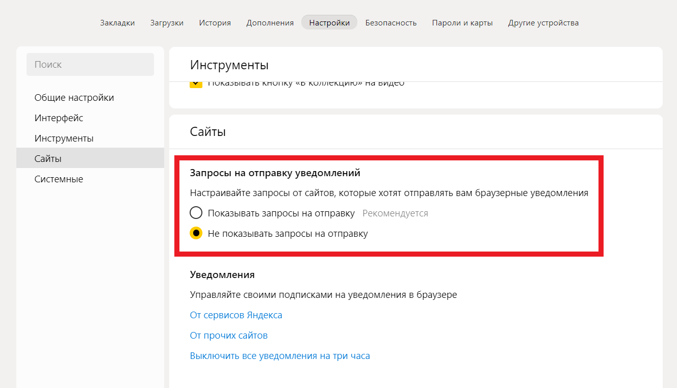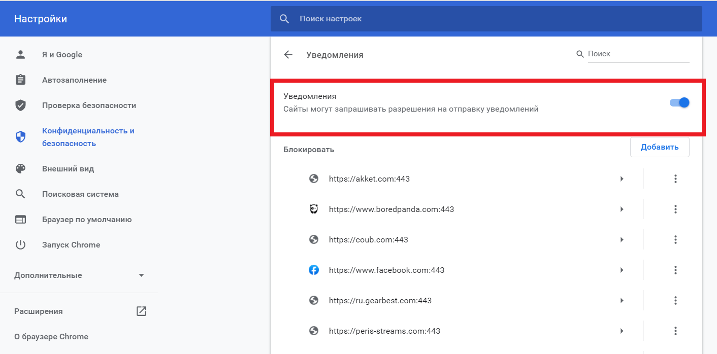 - Нажимаем на «Уведомления». На открывшейся странице первой же строчкой будет пункт с одноименным названием и надписью «Сайты могут запрашивать разрешения на отправку уведомлений». Справа от нее есть синий ползунок, отключив который вы деактивируете запросы от любых сайтов.