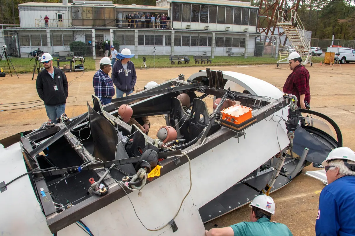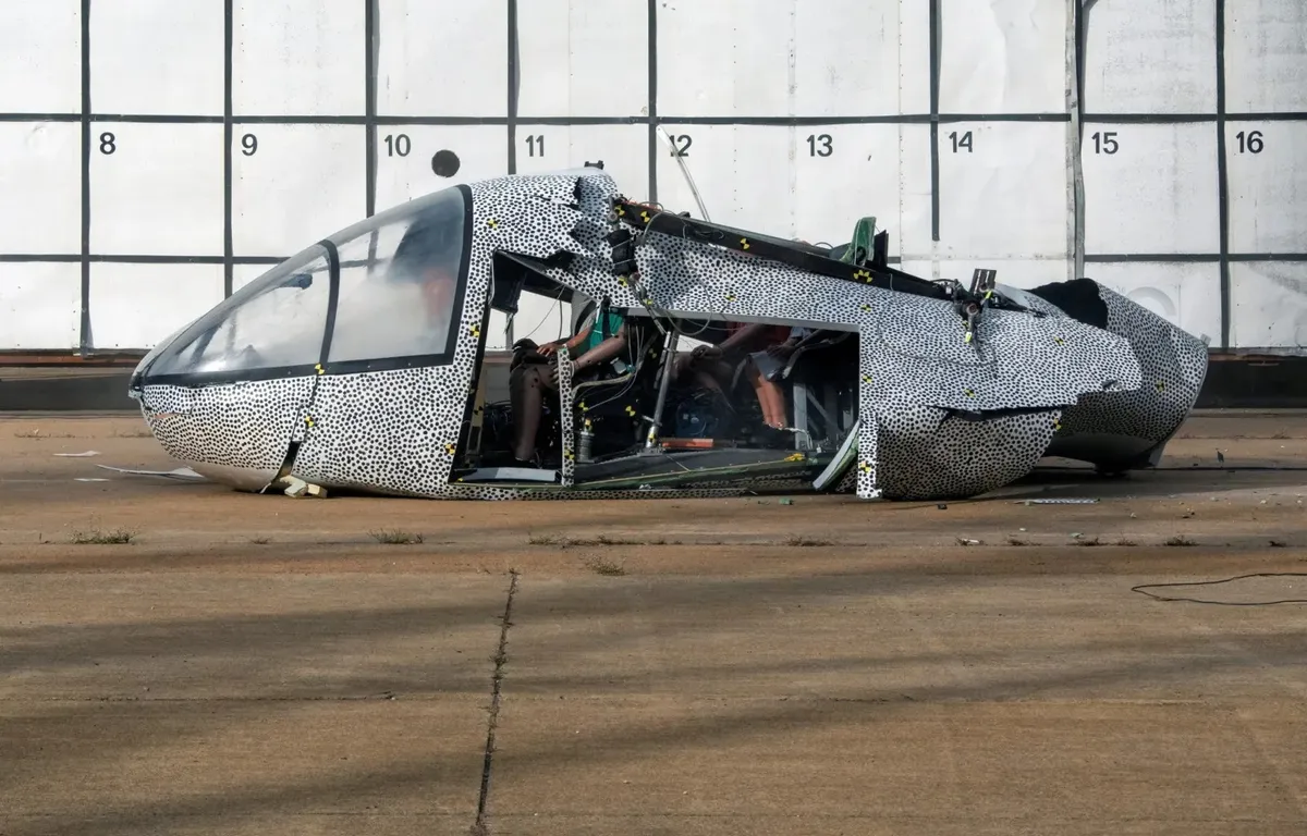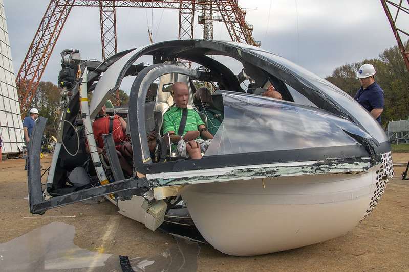 Испытание прошел автомобиль с композитным энергопоглощающим кузовом и шестью манекенами для краш-тестов. В Центре исследований приземления и ударов (LandIR, Хэмптон, Виржиния) его подняли в воздух с помощью системы подвесов, и сбросили вниз, имитируя аварию с диагональным пикированием. Перед сбросом в тестовую область было установлено 200 датчиков и более 20 камер, которые позволят инженерам определить степень реалистичности симуляции.