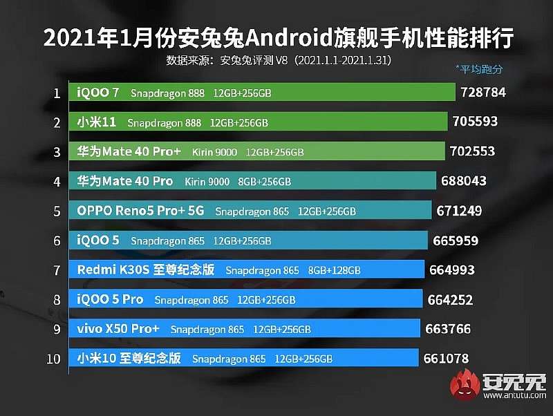 Он набрал почти 729 тысяч баллов, чуть меньше результат у другого китайского флагмана – Xiaomi Mi 11. Оба девайса выполнены на базе топового процессора Snapdragon 888, а дальше идут смарты от Huawei на Kirin 9000 – Mate 40 Pro и 40 Pro+.