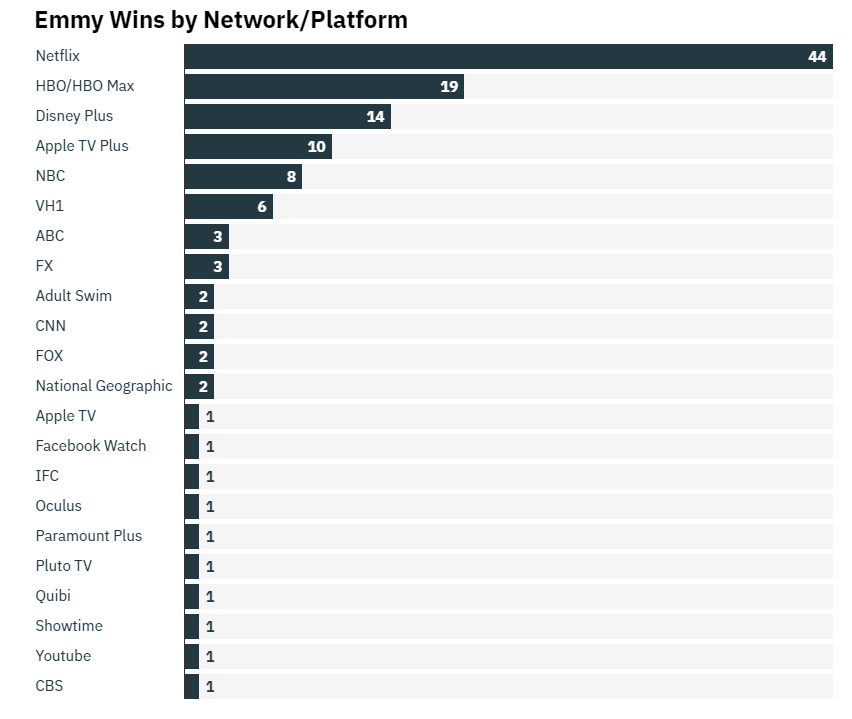 Впервые в истории стриминговый сервис Netflix опередил HBO по количеству наград. Онлайн-кинотеатр забрал 44 статуэтки, тогда как сеть получила лишь 19. На третьем месте Disney+ с 14 наградами, на четвертом – Apple TV+ с 11 «Эмми».
