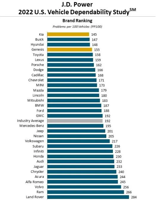 Всего в исследовании участвовали 32 бренда, включая премиальные вроде Lexus и Porsche. Изучались автомобили 2019 года выпуска, купленные новыми и находящиеся на протяжении 3 лет у одного владельца. Надежность определялась по количеству проблем, которые возникают на 100 автомобилей. У Kia коэффициент поломок составил 145 баллов (чем ниже — тем лучше), а усредненный результат всех 32 брендов — 192 балла.